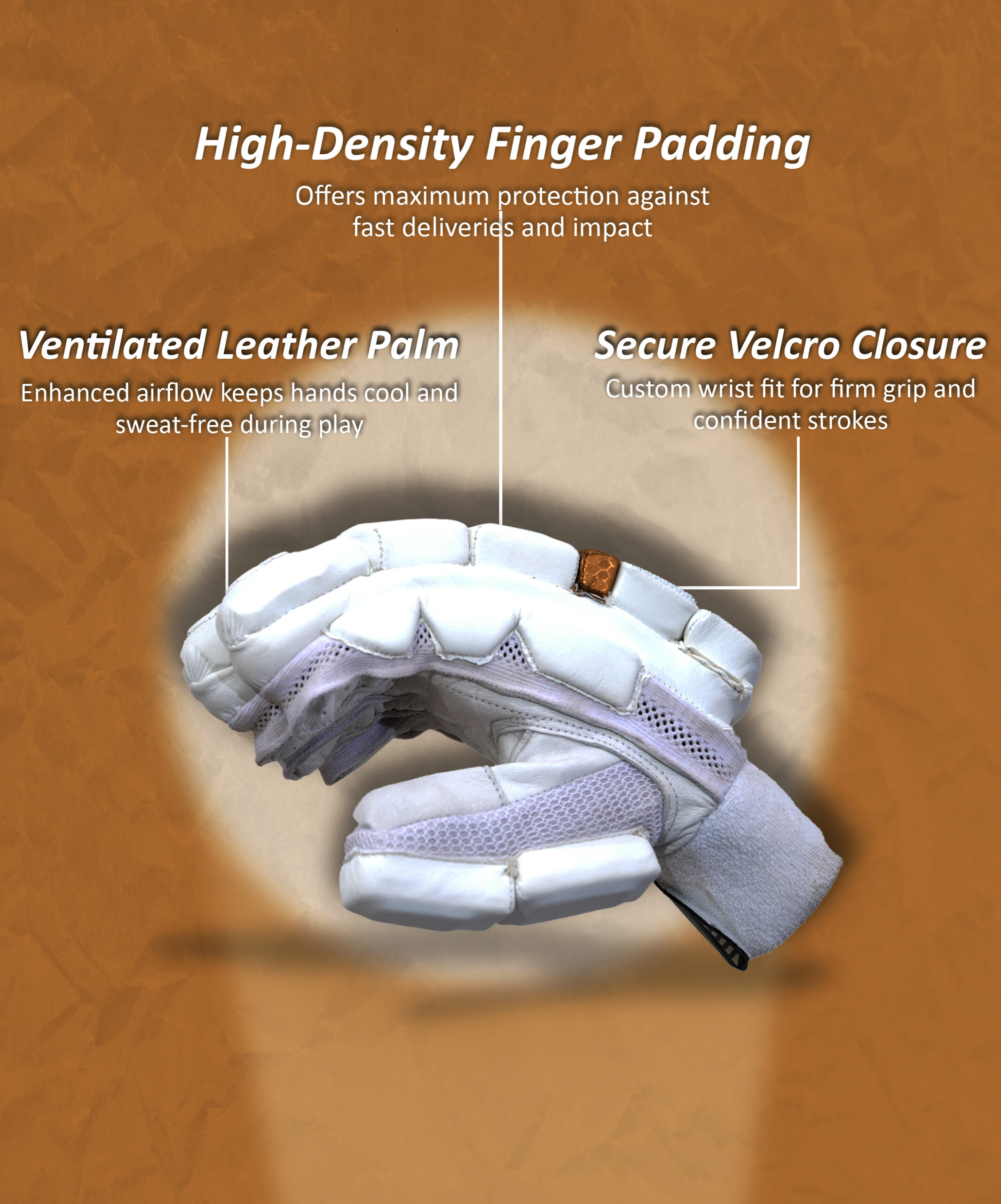 Master every shot with these white cricket batting gloves, designed for players who demand precision and protection. The palm area is crafted with premium textured material for a firm, antislip grip that keeps your bat steady through aggressive drives and defensive blocks. The gloves feature high-density foam padding across fingers and knuckles, offering reliable protection against fast deliveries. The ergonomic shape and pre-curved finger design allow natural hand movement, while mesh panels and ventilation holes ensure airflow to keep hands cool and sweat-free.