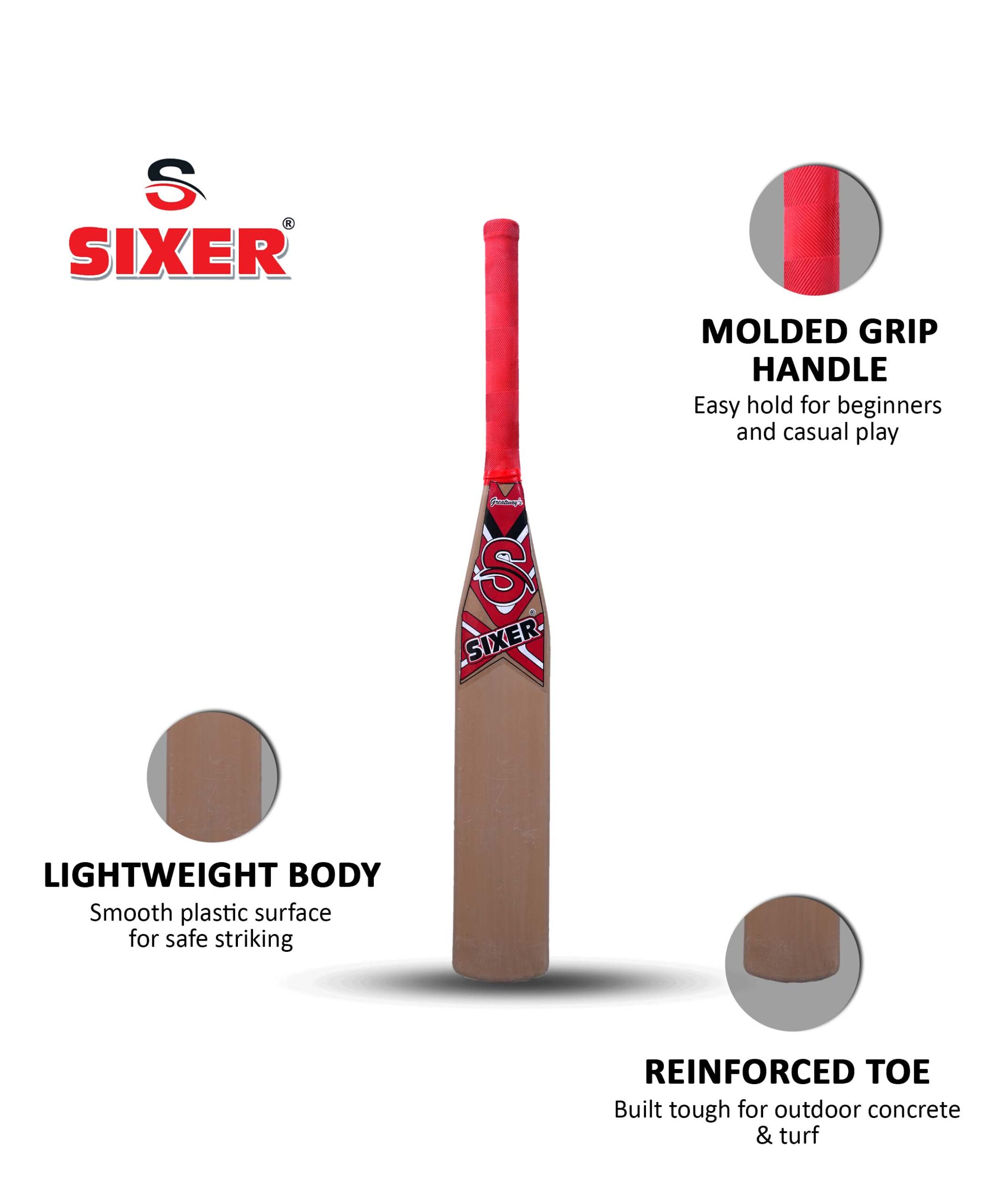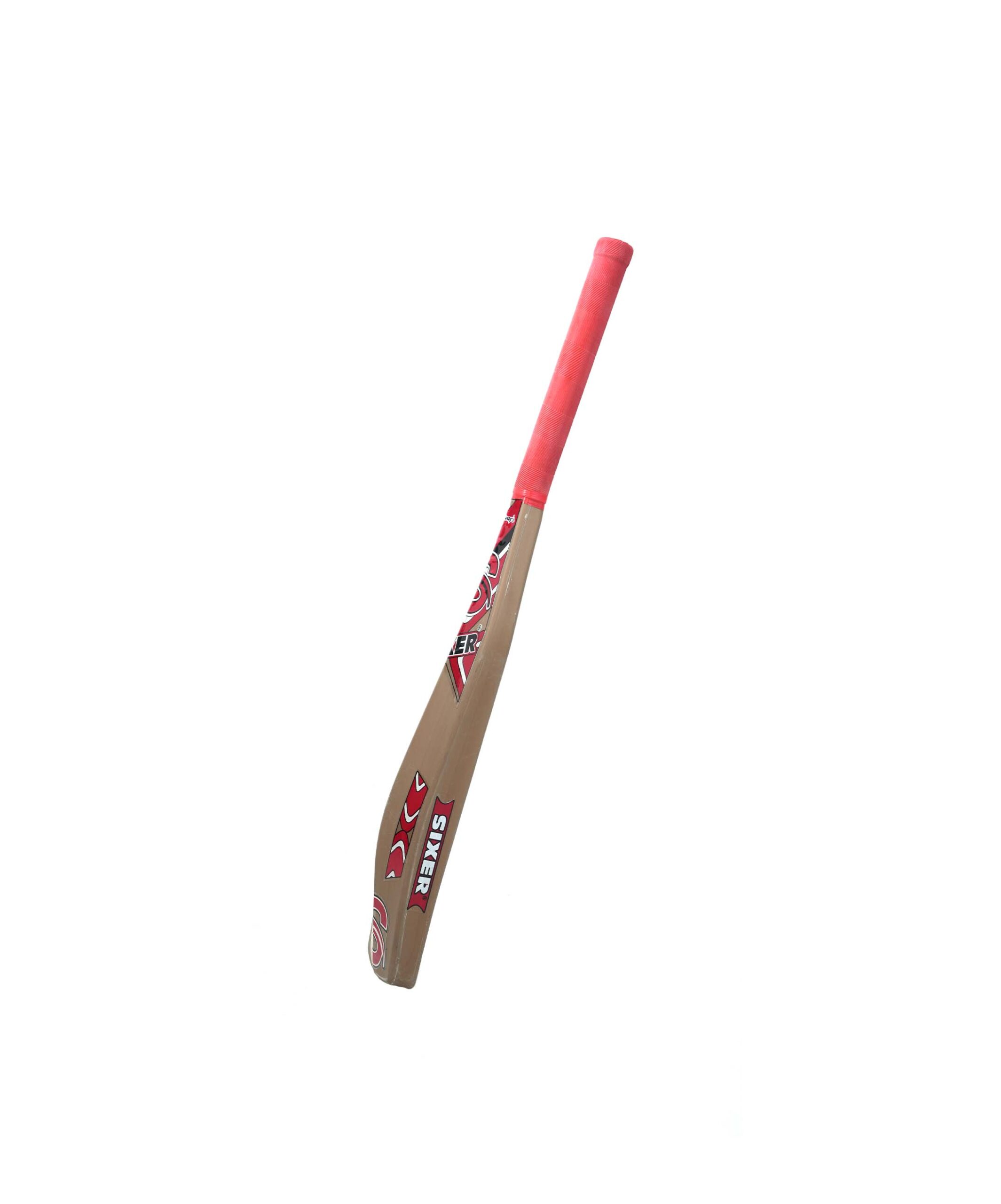 Made for taped tennis ball or soft ball cricket, it gives the player enhanced control and amplified power during bottom-hand play. The red sticker adds visual flair, while the design improves your hand speed and follow-through.