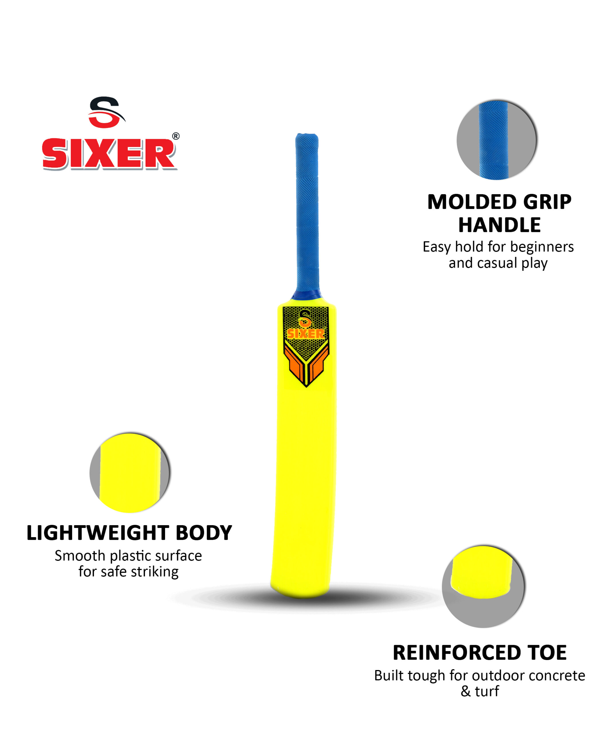 Make a colorful statement on the field with this lightweight yellow and blue bat—crafted for safe, smooth strikes in soft ball cricket.